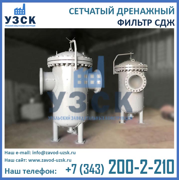 На формирование цены дренажного фильтра влияют следующие факторы: материальное исполнение, конструктивное исполнение, стоимость сырья в момент изготовления, комплектация, необходимость доставки в другой населенный пункт, срочность выполнения работ по изготовлению, прочие предпочтения заказчика. Уральский завод стальных конструкций изготавливает фильтры СДЖ-200 любого типового исполнения, а также нестандартные фильтры СДЖ 200 мм по чертежам заказчика или техническому заданию. Дополнительно к фильтрам СДЖ у нас Вы можете заказать сменные фильтрующие элементы любой тонкости фильтрации, ответные фланцы, прокладки и крепеж. По запросу изготавливаем также фильтры СДЖ-К-200 с концевым затвором. Для того чтобы узнать какова цена на фильтр СДЖ Ду200 с необходимыми Вам характеристиками, отправьте запрос в отдел продаж завода УЗСК по координатам, указанным в разделе «Контакты».